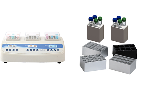 MiniT-H2C MiniT-H3 are 3-in-1 mini dry bath incubator. The MiniT-H2C is a heating and cooling incubator and the MiniT-H3 is a heating only incubator with 3 individually controlled mini dry bath. Many aluminum blocks are available covering a range of tube sizes from 0.2ml, 0.5ml, 1.5ml or 2.0ml tubes blocks. These are suitable for labs with heavy work load.